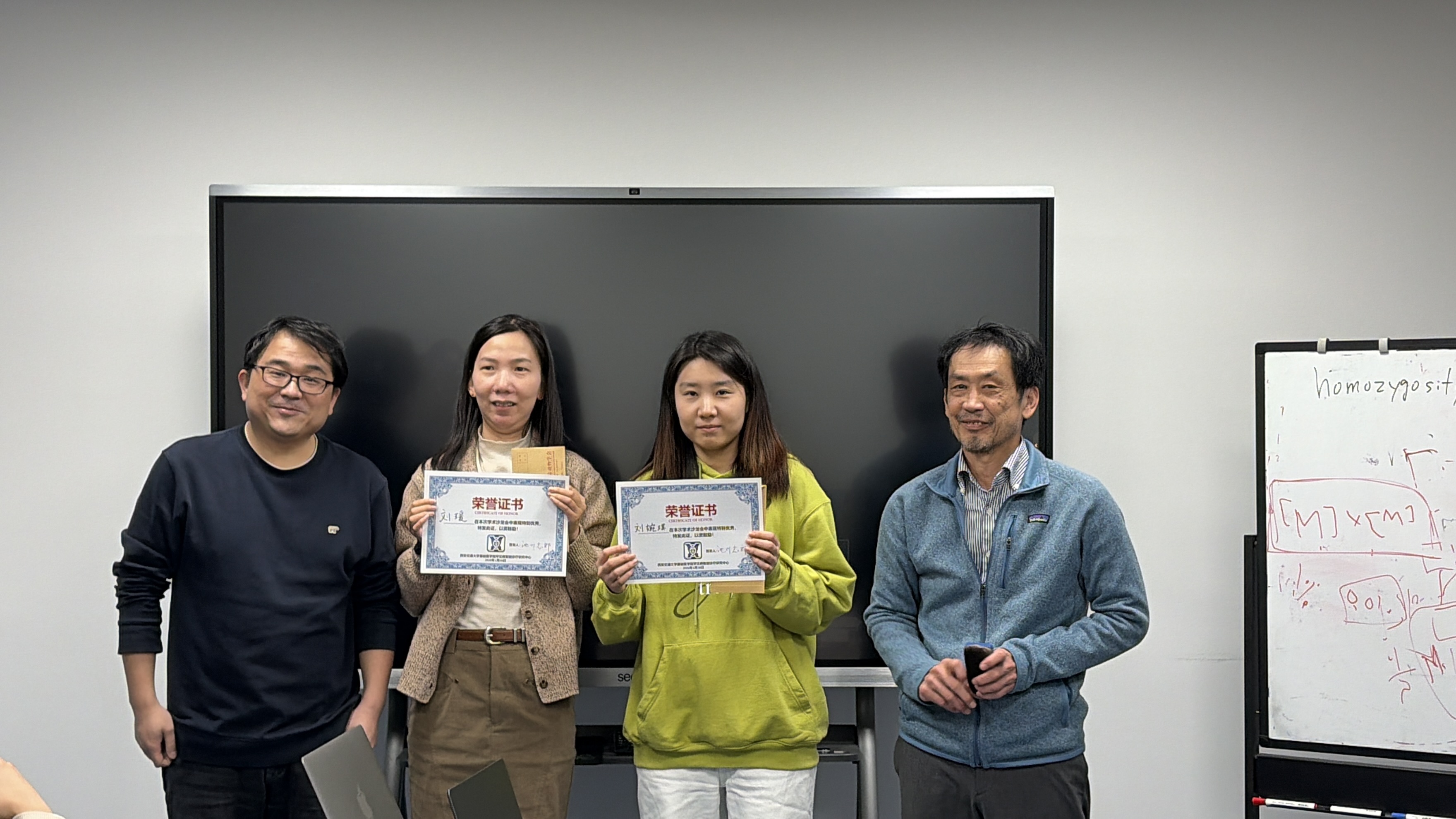 经课题组全体成员投票,刘瑗博士后和刘婉琪同学获得年末学术沙龙会best讲者,来访的Ikegawa教授为她们颁发了奖状和奖金。