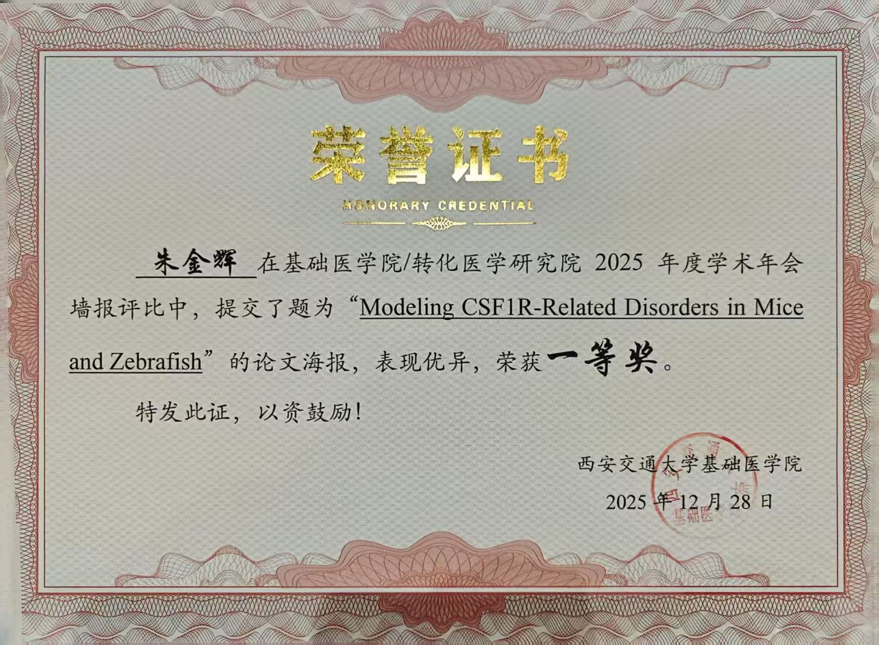 朱金辉同学在基础医学院/转化医学研究院2025年度学术年会墙报评比中荣获一等奖