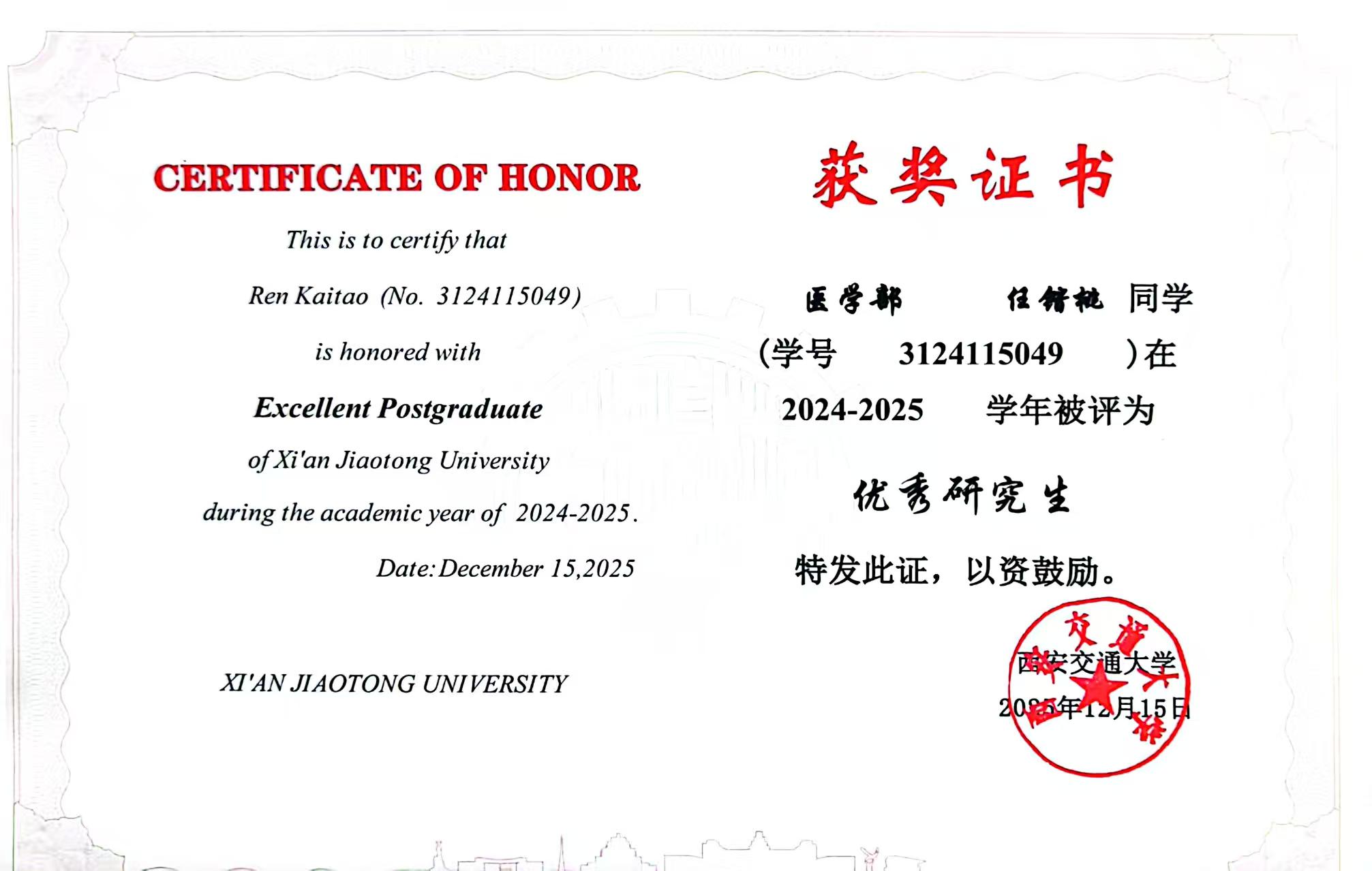 任锴桃同学获得2024-2025学年优秀研究生称号