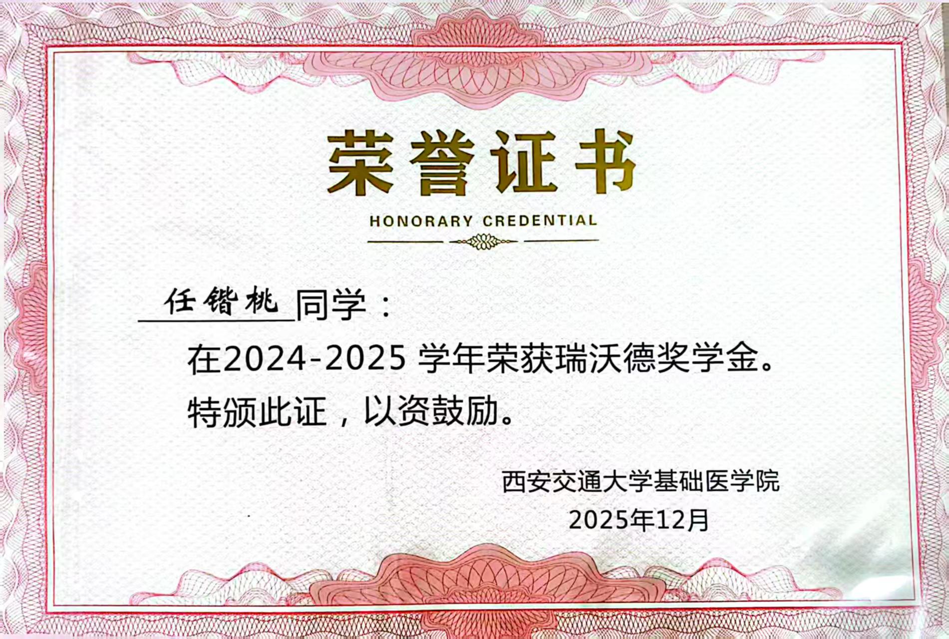 任锴桃同学获得2024-2025学年瑞沃德奖学金